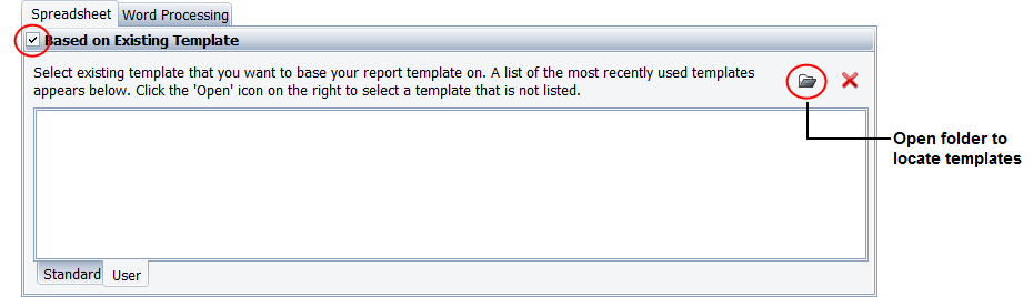 Click Spreadsheet or Word Processing. Select the Based on Existing Template check box and then choose a template from either the Standard tab (templates that are installed with the software) or the User tab (templates you have saved). Then click OK to create the report. (See Synthesis Workbook Templates.)