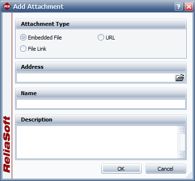 The Add/Edit Attachment window specifies the details of an individual file or URL, and will be displayed whenever you choose to create or edit an attachment.