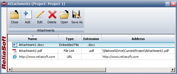 All ReliaSoft desktop applications support attachments at the project level. In all applications, project attachments can be displayed/managed from the Attachments icon in the Project Properties window.