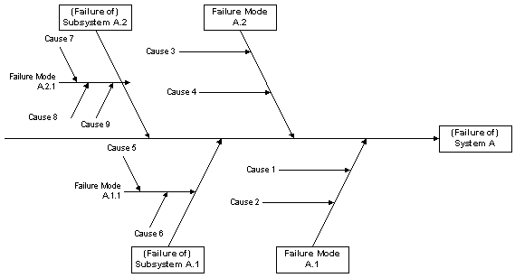 Although the cause and effect diagram does not have the traditional look of the Ishikawa or fishbone diagram, it can be read the same way. For example, the following diagrams show the events that lead to the failure of System A.
