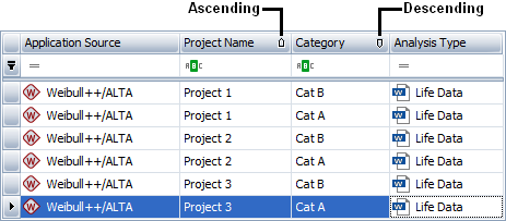 To sort the grid by multiple columns, right-click each column in the desired order and choose Sort Ascending or Sort Descending each time. For example, the following picture shows Synthesis Explorer data sorted first by project (ascending) and then by category (descending).