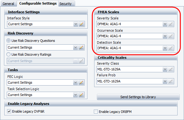 On the Configurable Settings tab, the FMEA Scales (Severity, Occurrence, Detection) are used for FMEA RPN metrics and item risk. The Criticality Scales (Severity Class, Failure Prob) are used for criticality analysis.