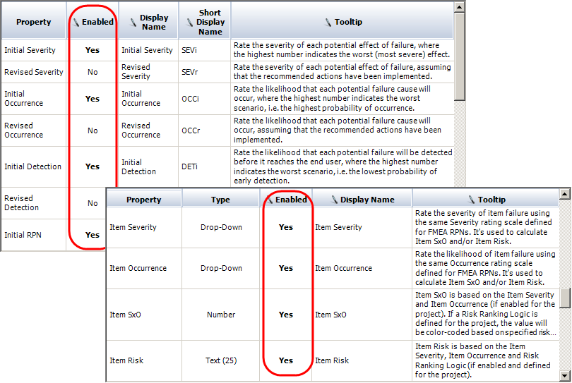 For FMEA metrics (calculated for the failure cause), use the table on the FMEAs > RPNs page of the interface style. For Item Risk metrics (calculated for items in the system hierarchy), use the Item > Properties page.