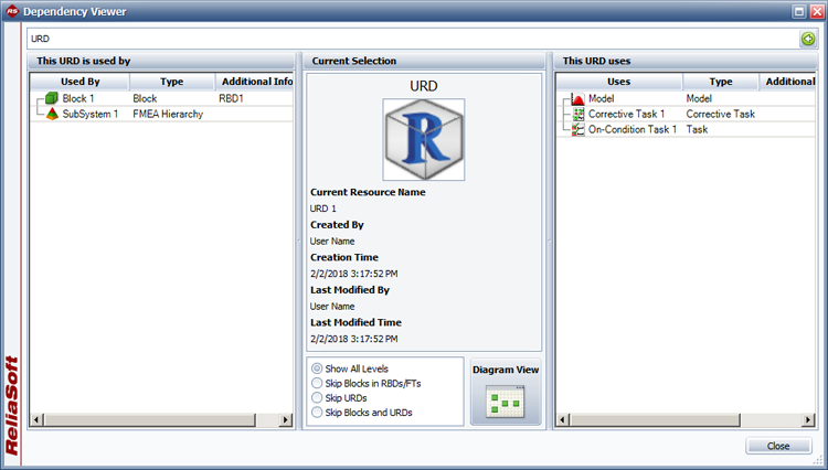 In the Current Selection area, you can choose what is shown in the This [resource] is used by area. You have the option to skip the URD and/or the block that the resource is used by. For example, the image below shows the connections among analyses and resources that we have been discussing. If you have selected to show all levels, you can trace from Reliability Model to URD 1 to Block 1 to RBD 1. But if you have selected Skip Blocks and RBDs, it just shows that Reliability Model is used by RBD 1.