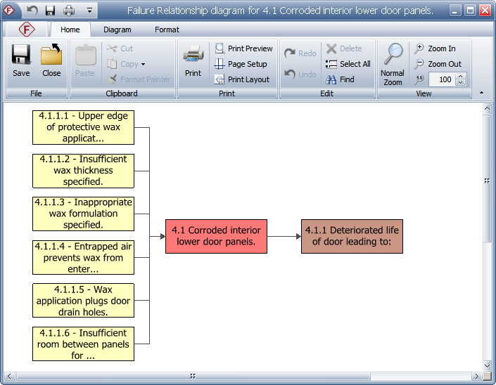 You can create failure relationship diagram for any failure in an FMEA. These diagrams present all of the causes and effects that have been defined for the selected failure.