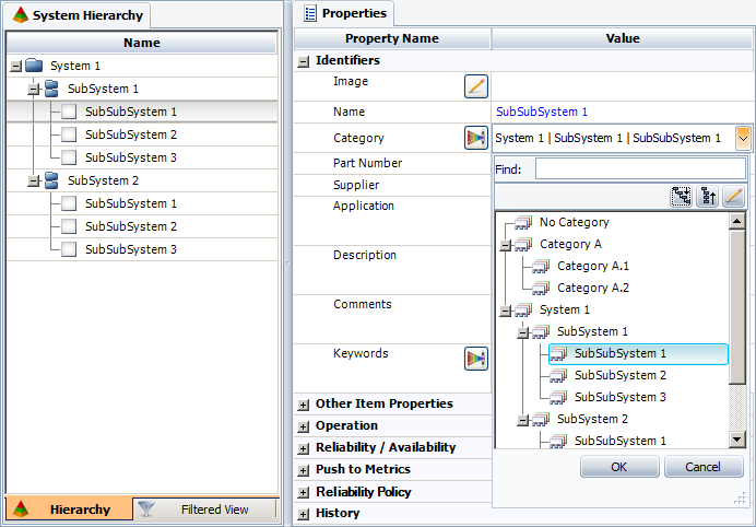 In all ReliaSoft desktop applications, you can use flexible categories and identifiers to find, filter and group analysis data. In XFMEA/RCM++/RBI, these properties can be assigned to any item in the system hierarchy. They apply for any analysis or diagram that is associated with the item.