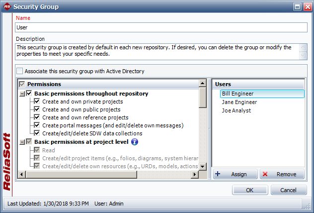 When you edit a security group, the left side of the Security Group window allows you to choose the permissions, while the right side shows all the users currently assigned to the group.