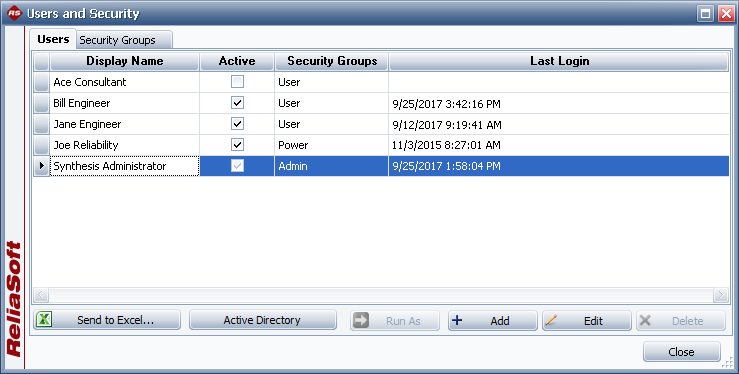This topic describes how to use the Users and Security window to create, edit or delete/deactivate user accounts. The same window can also be used to enable login security for a standard database or Synthesis file, and to manage security groups (permissions) for a secure database.