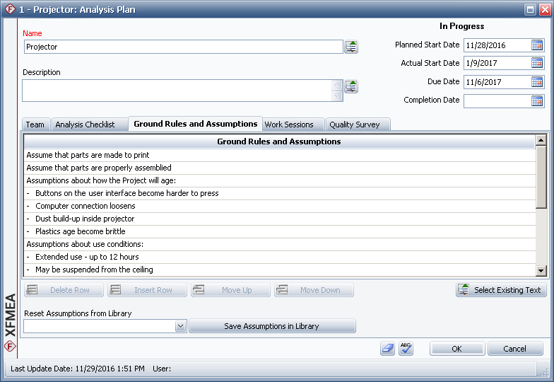 Analysis Plans allow you to keep track of team members, ground rules, estimated completion dates, scheduled work sessions and other details that will help you to plan and manage your FMEA and RCM projects.