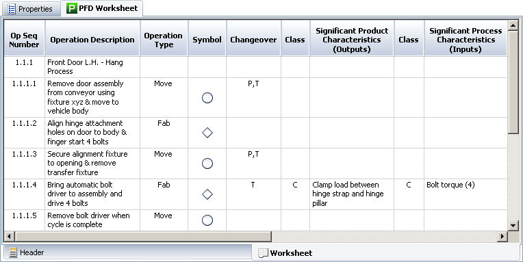 A PFD worksheet records detailed information, including process characteristics (inputs) and product characteristics (outputs), for each step of the manufacturing or assembly process. The complete PFD worksheet provides a structure for preparing process FMEAs (PFMEAs) and control plans.