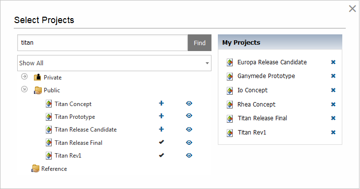 The left side shows all the projects that you have permission to view. You can apply any of the project filters that were created in ReliaSoft desktop applications, or use the Find box to filter by specific text in the project name. Use the icons to add a project to your list or just view it now.