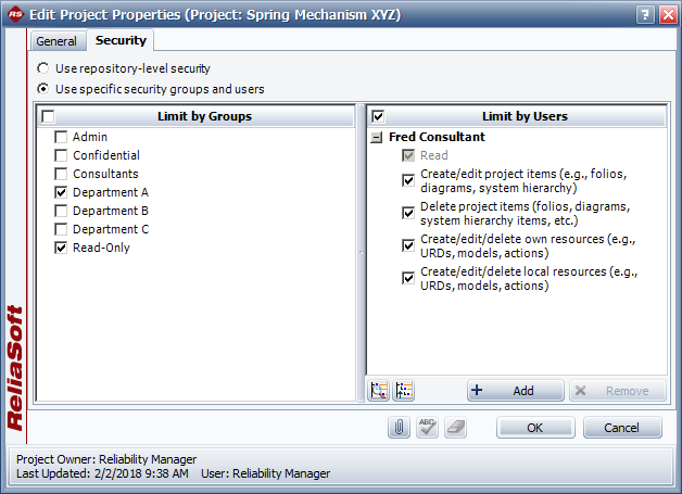 For the example shown below, users from Department A will have read/write access (because they belong to the "Department A" security group), users from Departments B and C will have read-only access (because they belong to the "Read-Only" security group) and Fred Consultant will have read/write access (because he belongs to the "Consultants" security group and has been specifically assigned to have those permissions in this project).