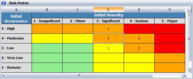 The Risk Matrix shows the quantity of FMEA causes, failure modes or items for each combination of ratings.