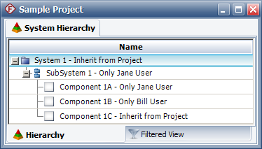 For a quick way to reset all of the item permissions to the defaults, you can open the Item Permissions window for SubSystem 1, set to Inherit from parent item and select the Apply to all dependents check box. The resulting system hierarchy is shown next.