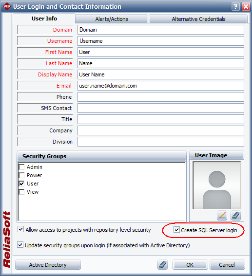 2. A database administrator for SQL Server can grant the appropriate level of database authority for creating SQL Server logins and database roles (e.g., securityadmin or sysadmin) to any user who has the ability to create user accounts in the Synthesis repository. The additional authority would be added directly in SQL Server. Then, when any of these administrative users creates a new user account via the ReliaSoft application, the required SQL Server login can be created and the application database roles can be assigned automatically at the same time.