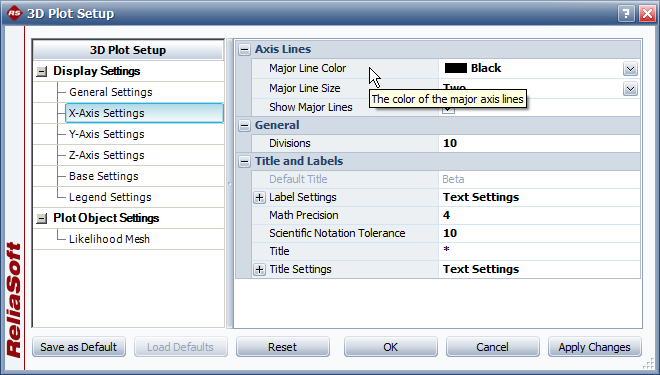 To save your changes and use them as the default setting for all new 3D plots, click the Save as Default button. This will overwrite the previous default settings.