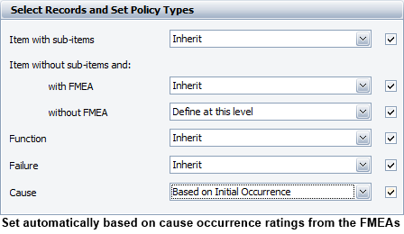 If you select Based on Failure Probability, Based on Initial Occurrence or Based on Revised Occurrence, the following logic applies. (See Using Rating Scales to Set the Reliability Policy.)