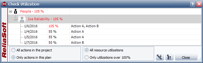 Regardless of whether you’re checking a single action or the entire project plan, the utility shows All resource utilizations by default. Alternatively, you can choose to see Only utilizations over 100%.