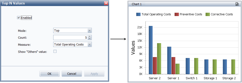 To configure the chart to show only the top 5, bottom 10, etc., use the Top N command in the Argument data item’s drop-down list.