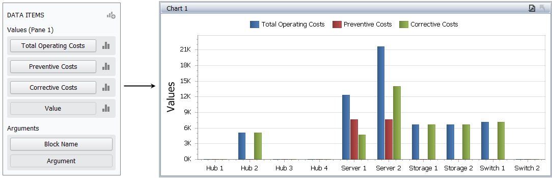 Choose the data field (or fields) that will be displayed in the y-axis of the bar chart, then drag each field into the Values area in the DATA ITEMS panel. For this example, the chart will display total operating cost, cost from preventive maintenance and cost from corrective maintenance.