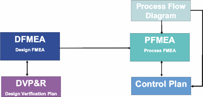 Within the automotive industry and some other industries, practitioners have integrated FMEA with other quality planning efforts, as shown in the following diagram and described next.
