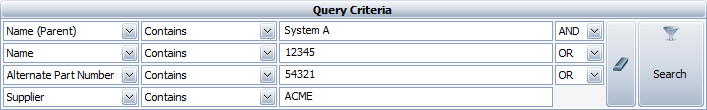 The Import Existing windows make it easy to find and import existing system hierarchy items or FMEA records. You can use up to four search terms, with the Boolean operators AND and OR.