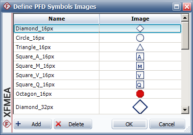 To customize the list of available images, click the PFD Symbols button at the bottom of the Modify Drop-Downs window. This opens the Define PFD Symbols Images window, as shown next. (This picture shows XFMEA, but it works the same in RCM++ and RBI.)