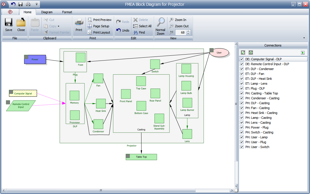 An FMEA Block Diagram visually depicts the system assembly that will be analyzed in a Design FMEA. These diagrams help to define the scope of a particular analysis project and also may provide additional information that will be useful to the analysis team when they attempt to identify potential failure modes.