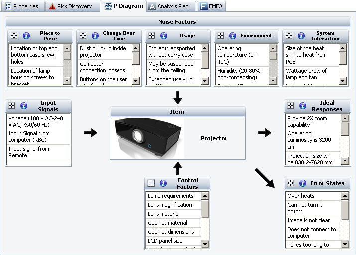 A Parameter Diagram (P-Diagram) is a structured tool that identifies the inputs from a system and relates those inputs to the desired system outputs, while considering the controlled and uncontrolled factors.