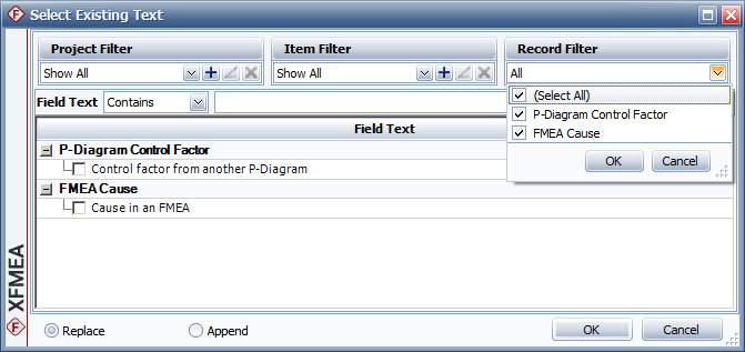In both cases you can use the filters at the top of the window to specify which descriptions are displayed. The following example shows the options for creating new rows in the Control Factors input box. For this type of input, you can select control factors from existing P-Diagrams or causes from existing FMEAs.