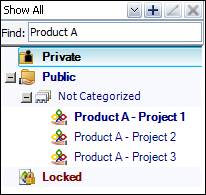 You can also search for projects by entering text in the Find field. The project list updates dynamically to show only the projects with names that contain the text that you have entered. As an example, the following picture shows a quick way to find all of the projects for a particular product line by using the project names instead of predefined categories or other filter criteria.