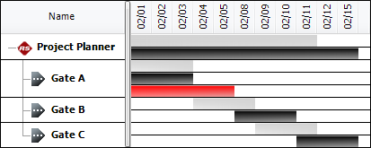 However, if Gate A completes late (shown in red), the expected timeline shifts for the remaining gates. (The overall plan bars at the top also indicate that the expected duration for the entire plan has now increased by two days.)