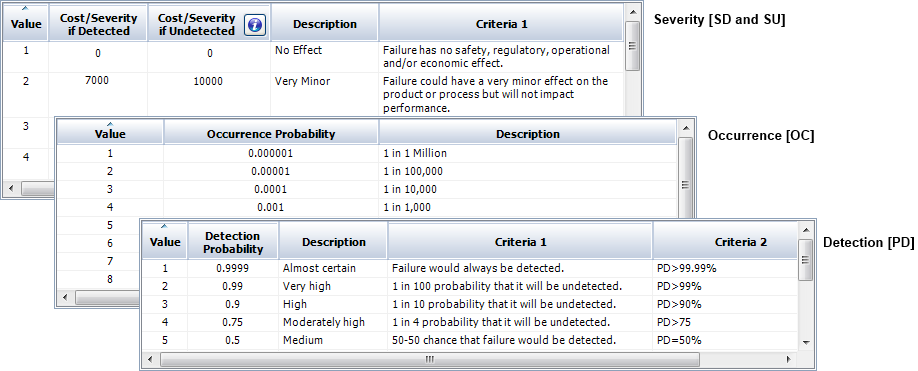 The QCPN calculations are based on the quantitative values associated with each rating in the Severity, Occurrence and Detection scales defined for the current project. As an example, the following picture shows portions of three rating scales that were set to meet the needs of a particular project. Your organization can choose different scales or configure the values to fit your particular products and processes.
