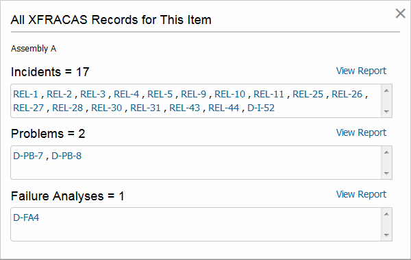 This opens a pop-up box showing all XFRACAS records for items that are identified as the "Responsible Part" for an incident, the "Part Category" for a problem or the "Repaired/Replaced Part" for a failure analysis.