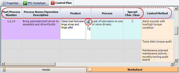The following example highlights the PCP columns that can be automatically populated by the sync process. (Note that the Control Method column can be synced only with PFMEAs.) In addition, you can use the Select Existing Text icon (also highlighted) to manually copy text from either the PFD worksheet or PFMEA, if desired.