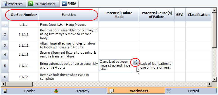 The following example highlights the FMEA columns that can be automatically populated by the sync process. In addition to the automatic sync, you can use the Select Existing icon (also highlighted) to manually copy selected product and process characteristic descriptions in the PFD worksheet to the failures and causes fields in the PFMEA, if desired.