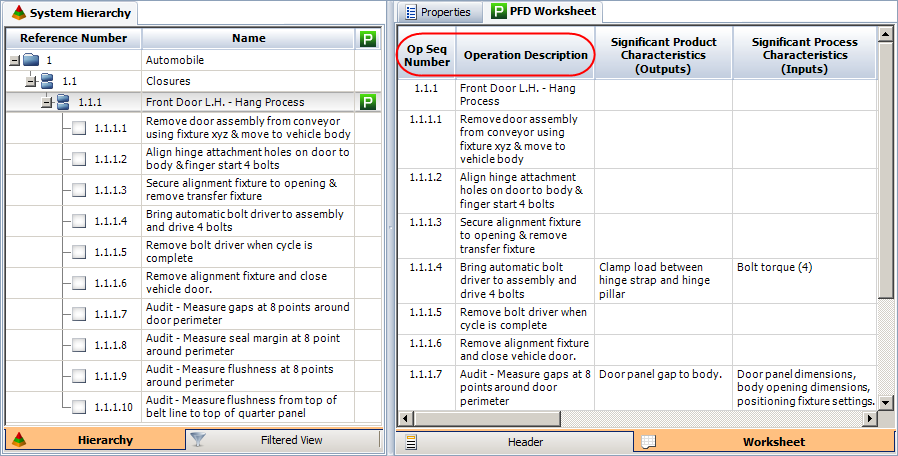 Generally, the system hierarchy is synced with the PFD worksheet, which is then synced with the PFMEA. The PFMEA is then synced with the PCP. The main advantage of the general sync workflow is that you’ll be able to track each process step across all worksheets via the reference numbers (operation sequence numbers). For example, process step #1.2.5 in the system hierarchy will have the same reference number in the PFD worksheet, PFMEA and PCP. In addition, the same operation descriptions will be copied across all worksheets. You’ll have the option to edit the descriptions after each sync process, if desired.