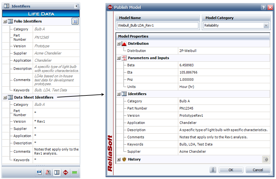 For published models, the identifiers are obtained from the analysis (e.g., Weibull++ folio, BlockSim diagram, etc.). To make a change, you must first edit the identifiers for the analysis and then republish the model.