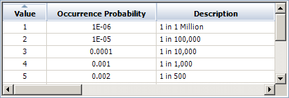 To configure either type of scale, you must enter the Occurrence Probability (Q) for each rating in the scale (this was called “Quantitative Value” in Version 8 and 9). As an example, here’s an excerpt from the “RS DFR Focus” occurrence scale that is installed with the software, where “1 in 1 Million” is 0.000001, and so on.
