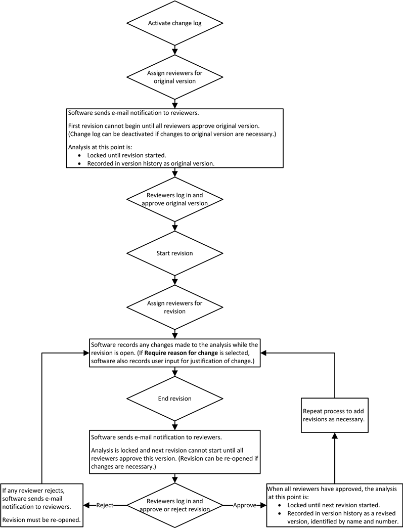 There are two general approaches to activating a change log and managing revisions, depending on whether or not you are using the electronic approval tracking feature. The flowcharts shown here demonstrate likely workflows for both scenarios.