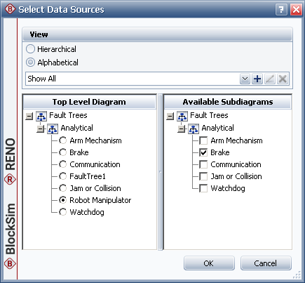 In the Select Data Sources window, first select a parent fault tree from the Top Level Diagram list. The Available Subdiagrams list will then show all of the fault tree subdiagrams referenced by the top level diagram or any of its subdiagrams. Select the subdiagram(s) that you are interested in and click OK to create the report.