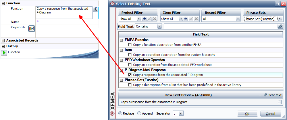 icon inside a text field, you can select text and either replace the current text or append the new text to the end. Starting in Version 2019, many text fields in XFMEA/RCM++/RBI allow selection of multiple descriptions, which will be concatenated in the order in which they were selected using the separator specified in the Separator field. Available separators include commas, periods, semicolons, dashes and, for multi-line text fields, new lines.