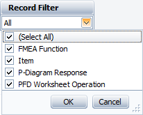 When the descriptions can be obtained from more than one type of analysis (e.g., when PFMEA failures can be copied from FMEA causes, or when control plan operations can be copied from PFD Worksheet operations), the headings in the table identify the source. You can use the Record Filter to specify which source(s) to include.