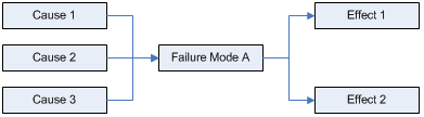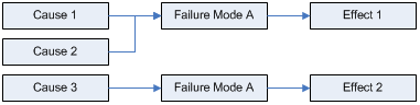 For example, if you have defined a failure mode rather generally, you might encounter a situation like the one diagrammed below where, for the same failure mode, one effect may result if Cause 1 or Cause 2 occurs but a different effect may result if Cause 3 occurs.