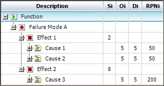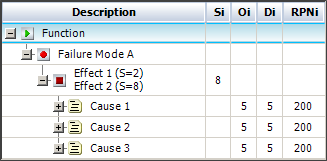 It should be noted that a "best practice" FMEA analysis approach typically encourages failure modes to be defined more specifically (i.e., where any of the causes of the failure mode will result in any or all of the effects) and the "Effects Before Causes" structure also supports that type of data entry. You would simply define all of the effects together in the same record (using CTRL+ENTER to force linebreaks in the text box when needed) and then choose a single severity rating that you want to use to calculate the RPN for all of the causes (e.g., the severity of the most serious individual effect, the severity of the most likely effect, or the severity of all effects occurring together). The following picture shows the analysis based on the severity of the most serious effect.