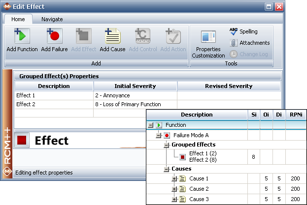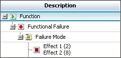 If you will always be defining the failure modes more specifically (i.e., where any of the causes of the failure mode will result in any or all of the effects) and you want the software to display causes and effects at the same level of the hierarchy under the failure mode that they are both associated with, choose Grouped Effects and Causes. This allows you to define the causes and effects associated with a particular failure mode in any order (instead of requiring effects to be entered first as in the "Effects Before Causes" structure). It also stores a separate description and severity rating for each effect. When using the RPN risk assessment method, the software will automatically choose the highest severity rating to calculate the RPN for all of the causes associated with that failure mode.