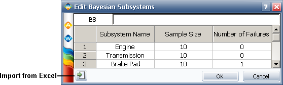 The Edit Bayesian Subsystems window is used to enter prior test data for subsystems that compose your system. When you select to use the non-parametric Bayesian test design method with the Reliability Demonstration Test (RDT) tool, this prior data is used to estimate the demonstrated reliability or confidence level that you can expect from a test's results, or the sample size that must be used in a test.