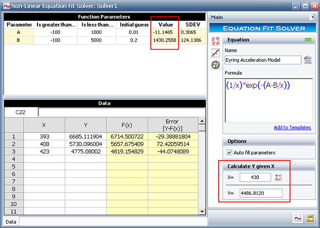 The parameter values are found to be A = -11.1465 and B = 1430.2558, as shown next. By obtaining the parameters, we can now estimate the mean life (y) for any given stress level (x) by using the Calculate Y given X tool. For example, in the picture shown next, the estimated mean life for a temperature of 430 K is 4486.81 hours.