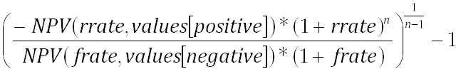 If n is the number of cash flows in values, frate is the Finance_rate, and rrate is the Reinvest_rate, then the formula for MIRR is: