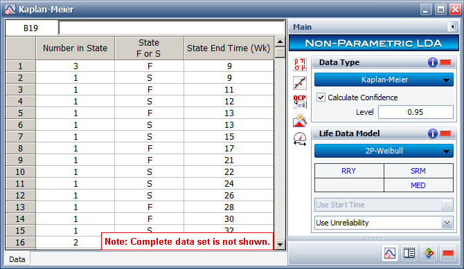 The software will perform a non-parametric analysis on the data set, and then automatically perform a separate standard life data analysis based on the settings specified in the Life Data Model area.